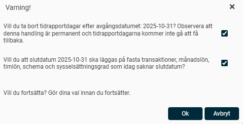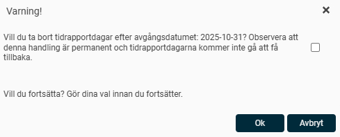 Kryssar du i rutan svarar du JA på frågan "Vill du ta bort tidrapportdagar efter avgångsdatumet?" och eventuella tidrapporteringar som har gjorts efter avgångsdatumet kommer att tas bort.