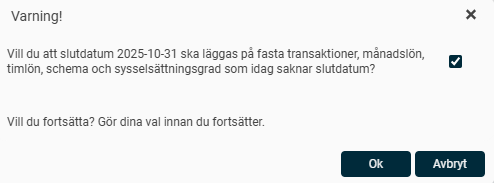 Kryssar du i rutan svarar du JA på frågan "Vill du att slutdatum ska läggas på fasta transaktioner, månadslön, timlön, schema och sysselsättningsgrad som idag saknar slutdatum?" Det innebär att dessa fält i HRM kommer få samma slutdatum som avgångsdatumet.