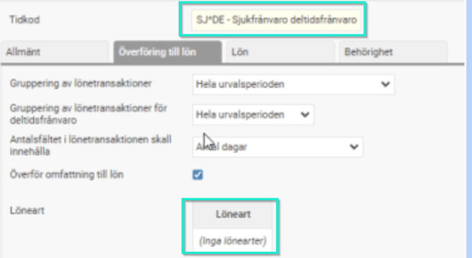 - På den nya tidkoden, ta bort kopplingen till löneart under fliken ”Överföring till lön” (så ingen överföring sker till lönesystemet).