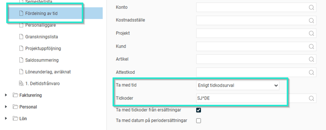 - Gör urval på tidkoderna för deltidsfrånvaro exempelvis SJ*DE"