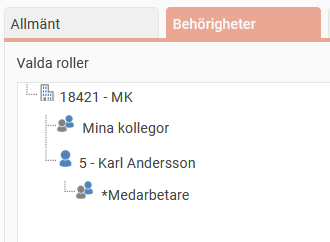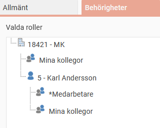 Exempel: Om du har rollen Mina kollegor på företagsnivå och rollen Medarbetare på din anställning, är det rollen Medarbetare som gäller för dig. Den specifika rollen för din anställning slår alltså ut den generella rollen för hela företaget.