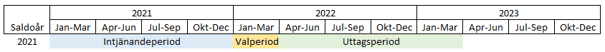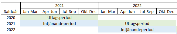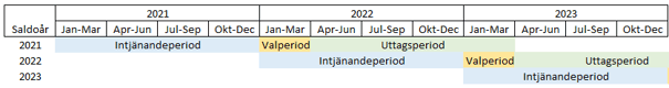 När uttagsperioden börjar startar samtidigt en ny intjänandeperiod. Bilden nedan visar de olika åren som hanteras parallellt vid olika tidpunkter. Under perioden jan-mars 2023 i exemplet har man saldon för tre olika intjänandeperioder samtidigt. Dels har man en uttagsperiod för det man tjänade in under 2021, dels har man en valperiod för de pengar man tjänade in under 2022, samtidigt som man har påbörjat intjänandet under 2023.