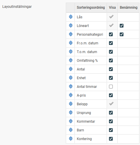 I den här funktionen kan du anpassa vilka fält du ser i löneberedningen. Använd de blå pilarna för att ändra fältens ordning. Du klickar på symbolen och drar fältet till den rad du vill ha det på.
