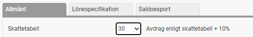 Här anger du företagets generella skattetabell. Den här tabellen används om en anställd saknar en skattetabell under Personal > Anställda, fliken Skatt. Systemet drar då skatt enligt denna tabell samt ytterligare 10 % skatt, enligt gällande praxis.