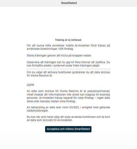 Första gången du använder SmartDetect går du via knappen Avvikelser längst upp i löneberedningen och då kommer du att få ett meddelande om att träning är ej initierad. Du behöver klicka på knappen Acceptera och initiera SmartDetect (detta görs bara en gång per företag). Efter det att träningen är klar är SmartDetect klar att användas i företaget och den kommer att fortsätta att träna sig själv med hjälp av ert företags framtida lönekörningar.