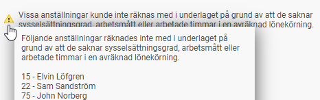Om nödvändig information saknas på en anställd undantas denne från beräkningen och visas istället i en separat varningslista i vyn enligt nedan.